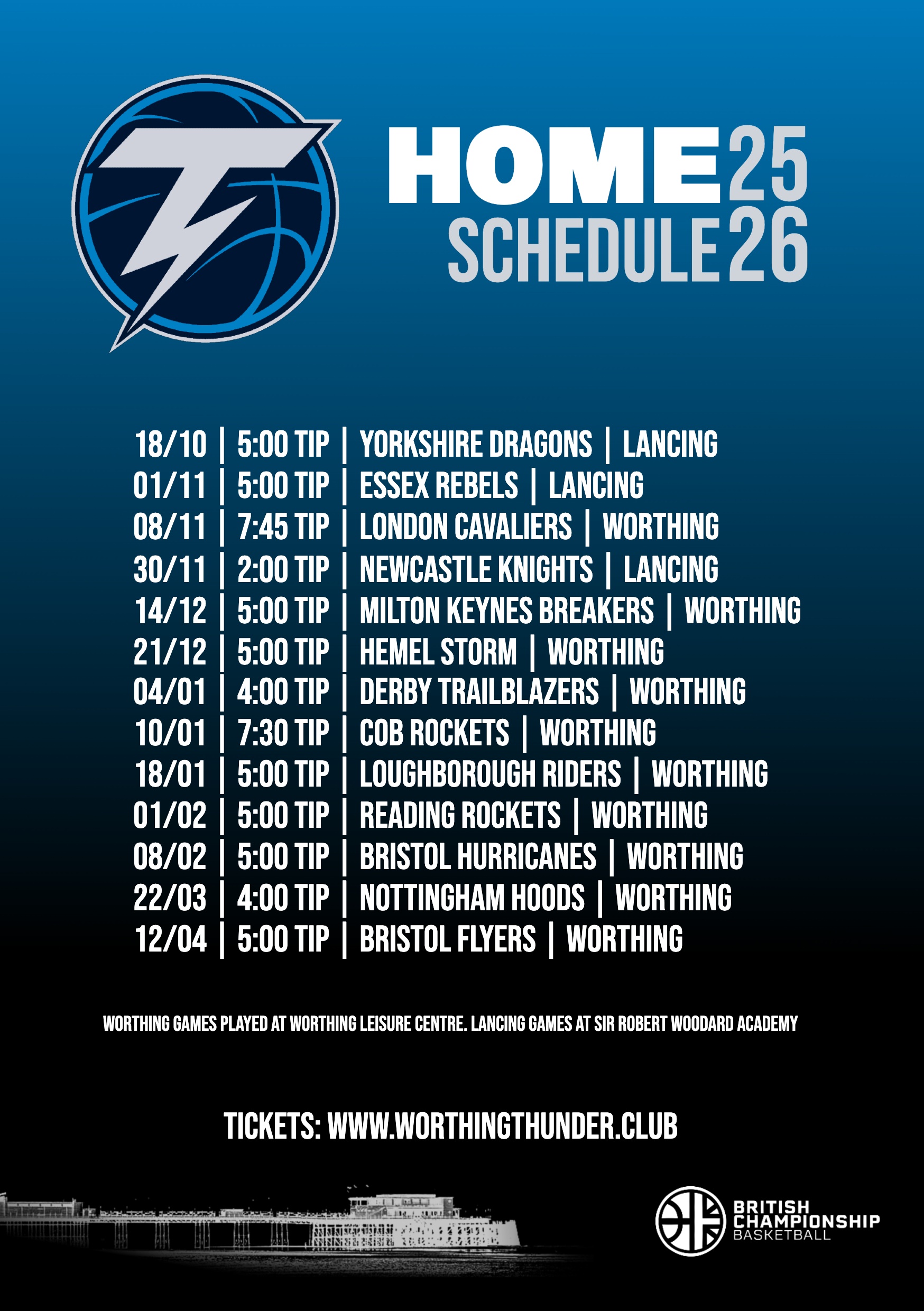 | Sun 12 Apr 26 | 5:00 PM | Worthing Thunder | Bristol Flyers | League | Worthing Leisure Centre | Buy |
